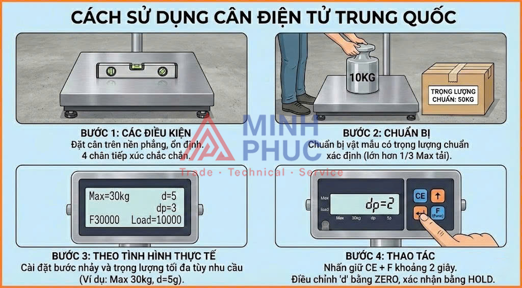 Đồng thời, nên tránh cân quá tải, hạn chế va đập mạnh và kiểm tra nguồn điện thường xuyên để đảm bảo thiết bị vận hành ổn định. Việc đọc kỹ hướng dẫn sử dụng và bảo dưỡng định kỳ sẽ giúp cân duy trì độ chính xác, hạn chế sai số và kéo dài tuổi thọ trong quá trình sử dụng lâu dài. Để sở hữu một chiếc cân điện tử Trung Quốc chất lượng, uy tín. Quý khách hàng vui lòng liên hệ ngay hotline của Minh Phúc: 09.4108.4108.