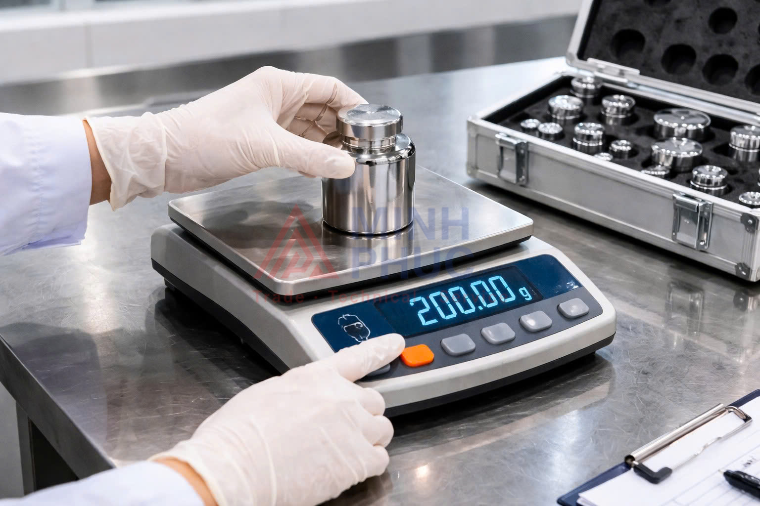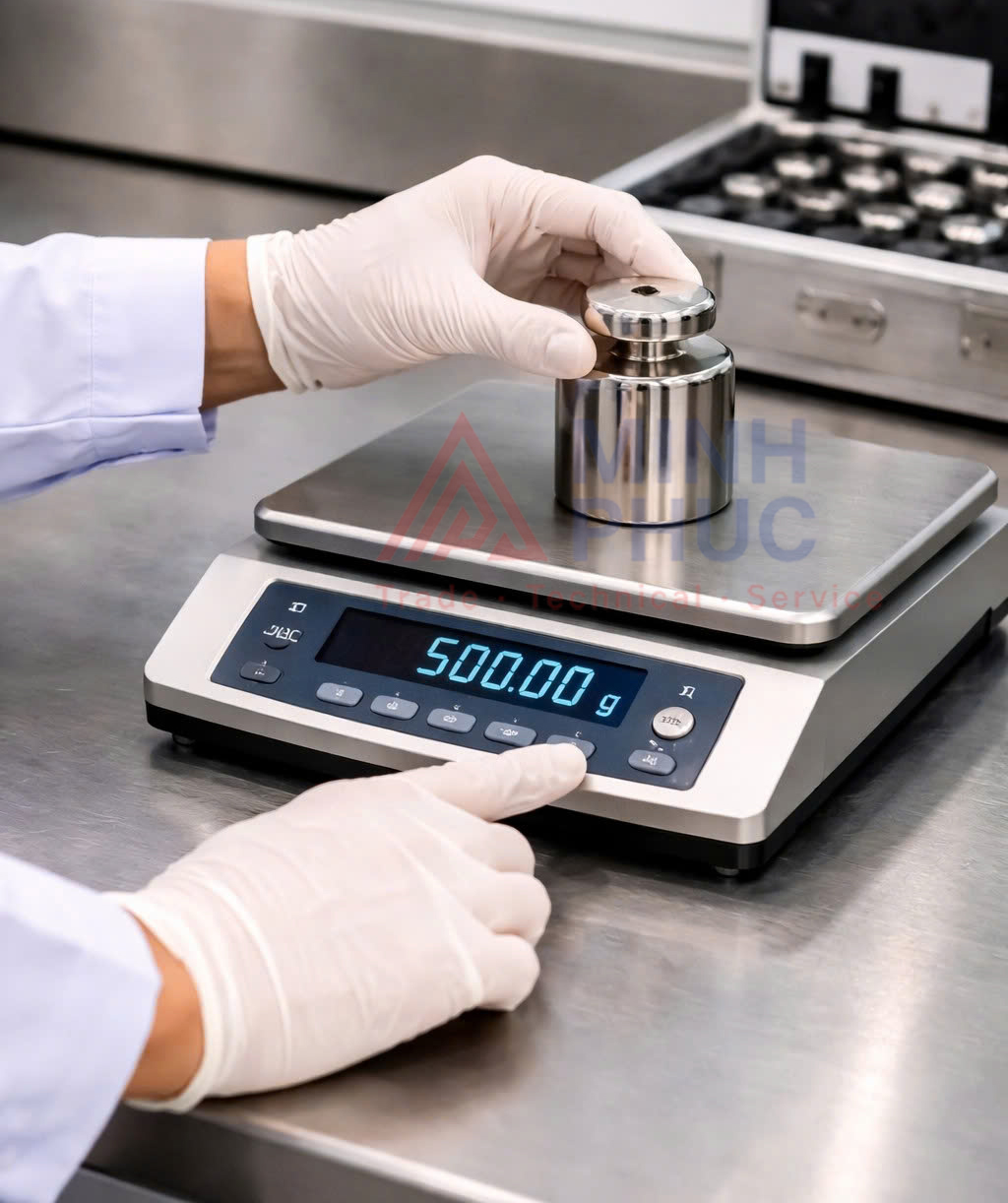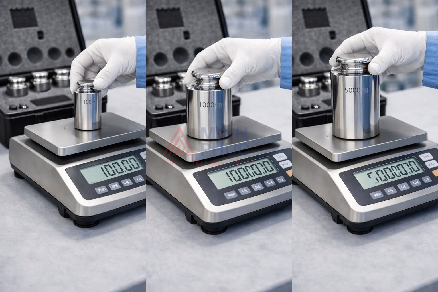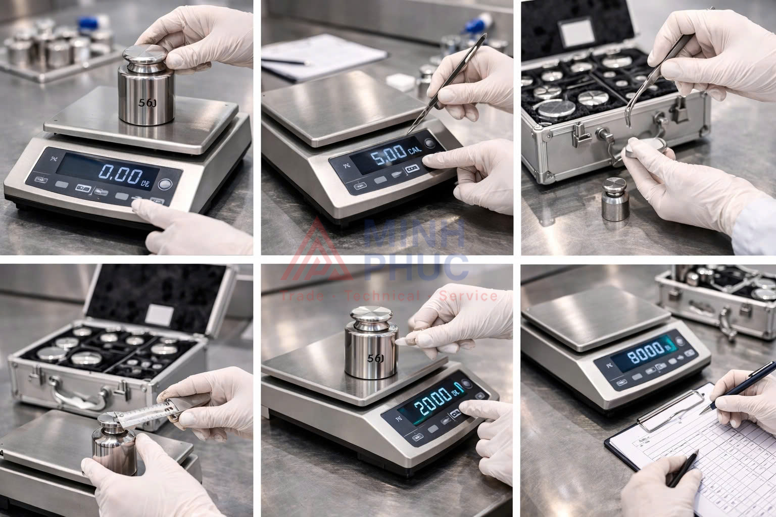 Chỉ sử dụng quả cân chuẩn đã được kiểm định, có cấp chính xác phù hợp với loại cân. Không dùng vật thay thế vì sẽ làm sai lệch kết quả hiệu chuẩn.