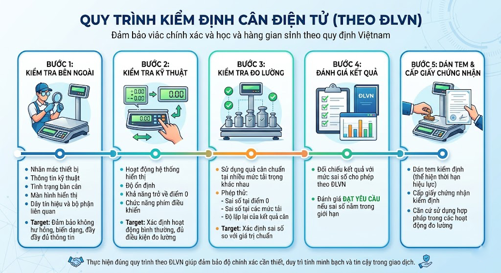 Kiểm định cân điện tử được thực hiện theo các quy trình kỹ thuật đo lường do Nhà nước ban hành, thường được quy định trong các ĐLVN (Quy trình kiểm định phương tiện đo). Quy trình này nhằm đảm bảo cân điện tử hoạt động chính xác, đáp ứng các yêu cầu kỹ thuật và sai số cho phép trước khi đưa vào sử dụng hoặc trong quá trình sử dụng.