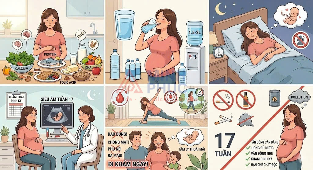 Để đảm bảo thai nhi phát triển tốt, mẹ cần duy trì chế độ dinh dưỡng khoa học, sinh hoạt hợp lý và khám thai định kỳ. Sự chăm sóc đúng cách ở tuần 17 sẽ là nền tảng vững chắc giúp bé phát triển toàn diện trong những tháng tiếp theo. Hy vọng qua bài viết trên của Minh Phúc, quý độc giả đã có thêm kiến thức hữu ích về thai 17 tuần rồi nhé.